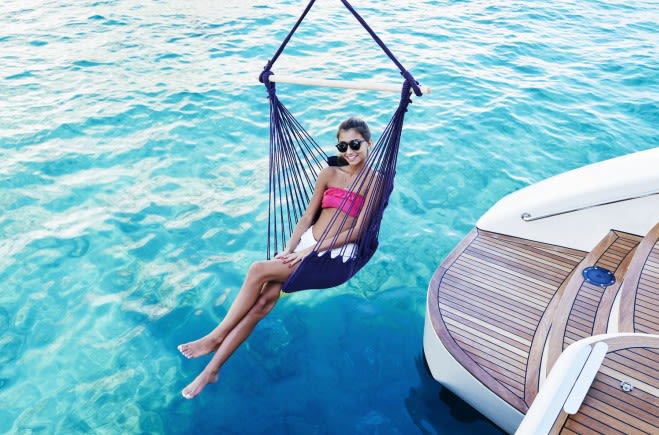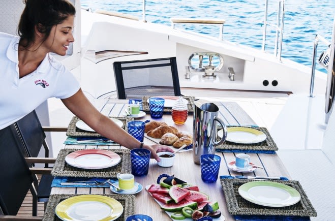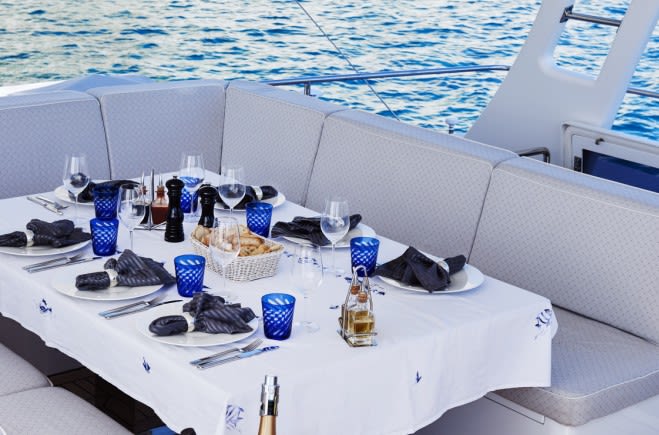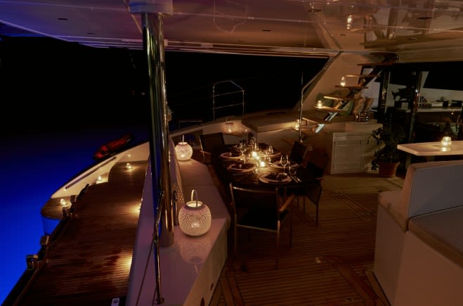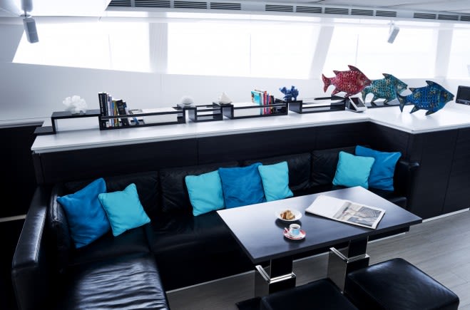 Салон яхты — просторный и яркий; особую атмосферу здесь создают панорамные окна. Мягкая мебель с элегантными акцентами делает салон идеальным местом для отдыха и развлечений.