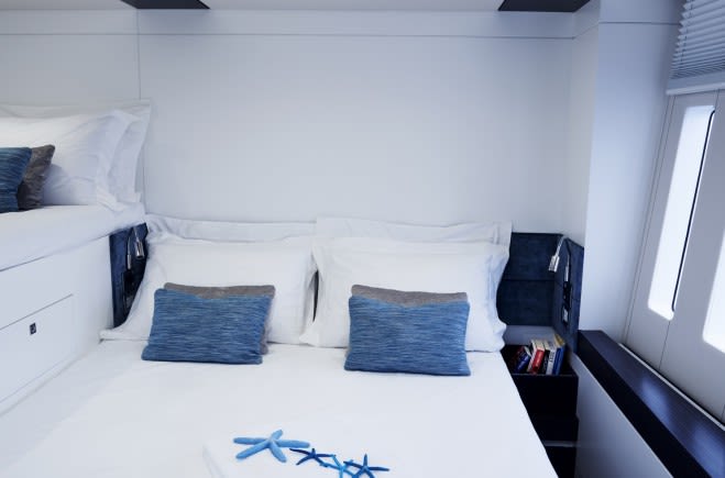 Роскошные каюты на борту оформлены в богатой палитре оттенков серебристого и аметистового цветов, оборудованы всем необходимым и располагают достаточно большим пространством.
