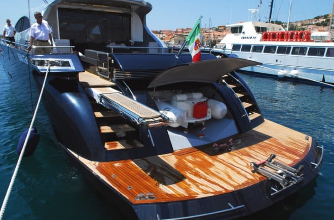 Кормовая платформа ведет к кокпиту, где подушками для загара устелено все вплоть до самого вместительного дивана. Пройдя вперед, мы обнаруживаем С-образный диванчик с раздвижным столом на 8 или 10 персон. Он стоит у бара с холодильником и барбекю. Тень от нависающей рубки защищает от солнца, причем этот «козырек» можно выдвинуть еще на пару метров при помощи электрического привода. И таким образом практически весь кокпит окажется в тени.