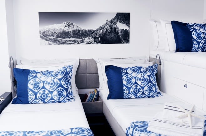 Стильные каюты предлагают гостям гармонично сочетать удовольствие от уединенности и комфорта. Интерьеры кают воплощают идею покоя и тишины, здесь гости чувствуют себя как дома и одновременно наслаждаются сверхсовременным дизайном в изысканном стиле урбанистического шика: роль акцентов в цветовой гамме играет белье насыщенного рубинового и изумрудного цветов, напоминающих оттенки драгоценных камней.
