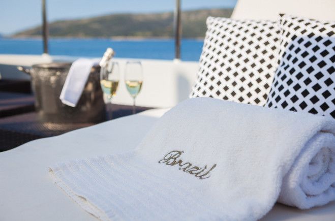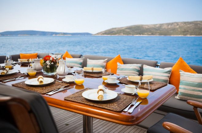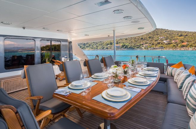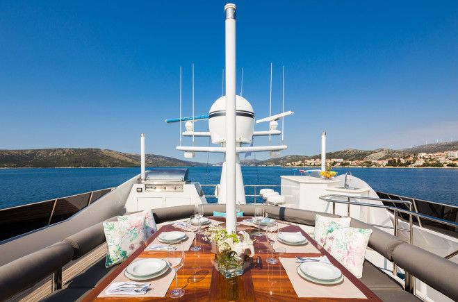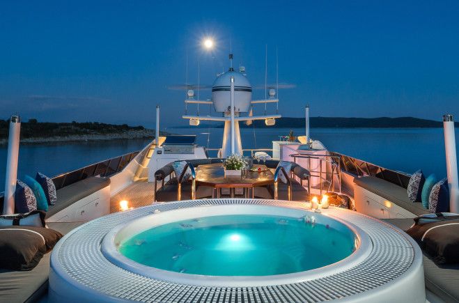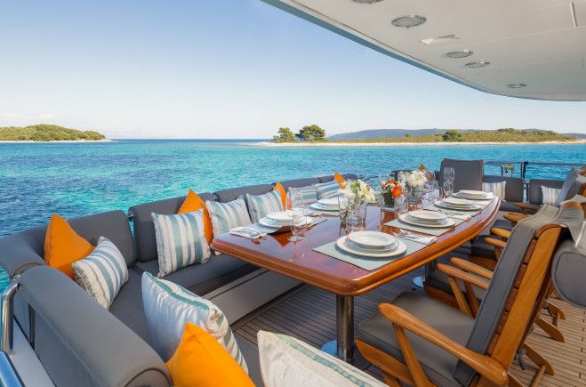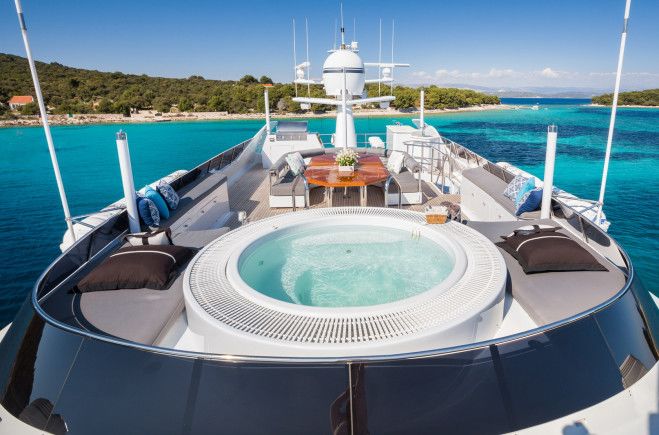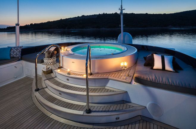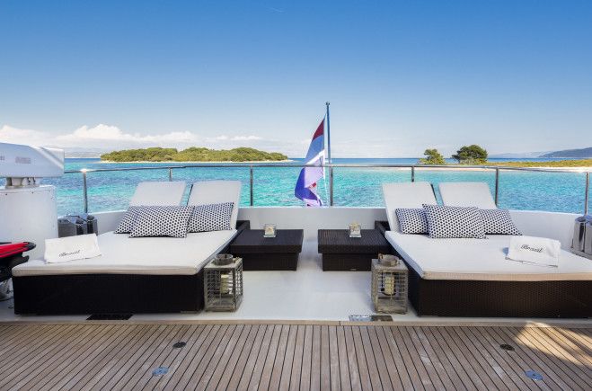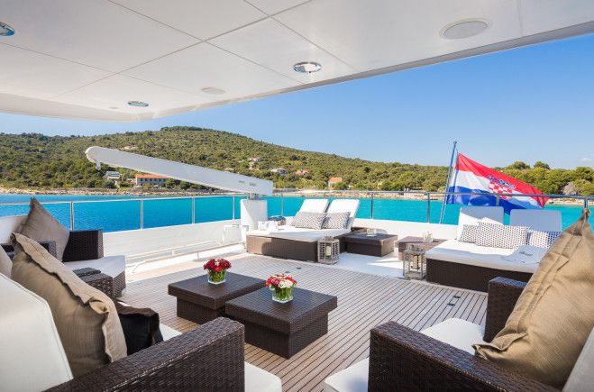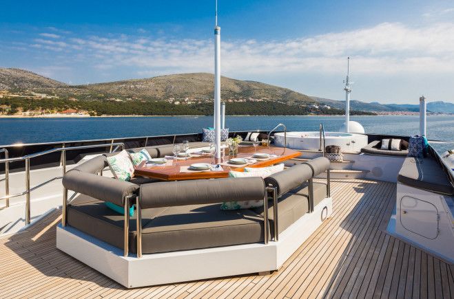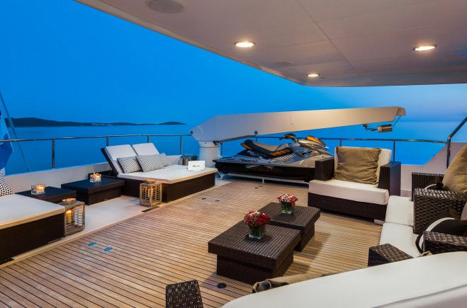 A sundeck with dining table, barbecue and jacuzzi. A mid deck with lounge chairs and sofas. An aft deck dining area. Enjoy sun and shade however you choose.