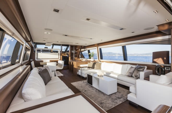 Большая обеденная зона находится на флайбридже, здесь разместился обеденный стол U-образной формы, зоны гриля с холодильником и бар с двумя стульями. В задней части значительного размера флайбриджа находятся два удобных шезлонга и зонт от солнца. Еще одна зона для отдыха и загара расположена на сандеке ближе к корме.