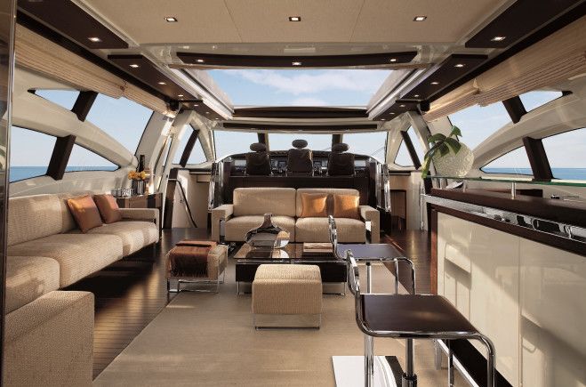 All wood used on the outside deck areas is a light teak wood and all seating areas on these decks are covered with a subtle “Crocodile” cloth material in a fresh and light beige color. The main salon is radiant and bright due to the large glass windows and more so due to the part glass sunroof ceiling. Upon entering the salon you will immediately be struck by the beautiful tones of her interior, the use of rich, dark teak wood for the floor and other details, combined with the use of glass and accented with cream coloring. This dark wenge wood, glass and cream coloring is used throughout the interior yacht.