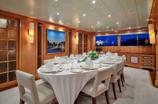 Уникальной особенностью яхты является обеденная зона в носовой части, которая станет идеальным выбором как для романтического ужина, так и для совместных трапез в кругу семьи и друзей.