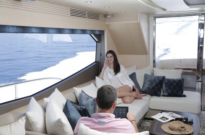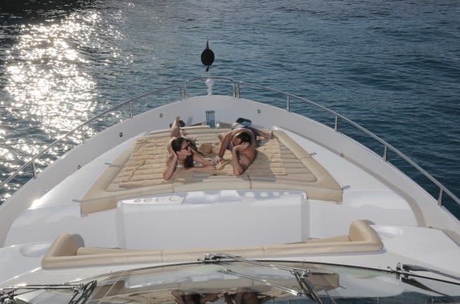Просторный флайбридж был задуман именно как территория развлечений: здесь расположен бар, матрасы для принятия солнечных ванн и оборудована обеденная зона. Это замечательное место для отдыха в уединенной бухте. Если вам захочется испытать захватывающие чувство скорости, то яхта будет нести вас вдоль красивейшей береговой линии на скорости 34 узла.