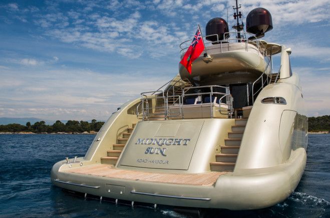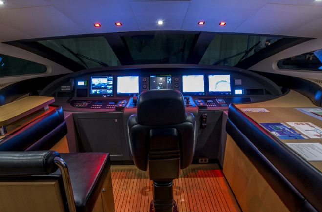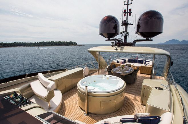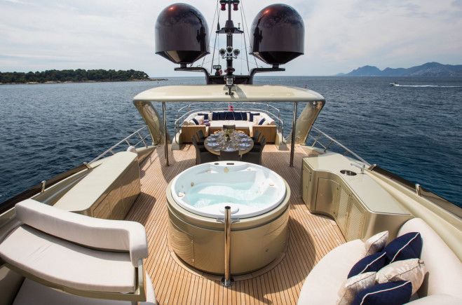 Top Deck- Jacuzzi which doubles as large sunpad, very spacious "U" shaped sunbathing/lounge area aft, seating and sunpad forward. Large umbrella over Jacuzzi area for shade.