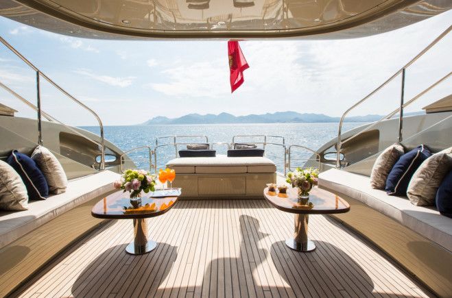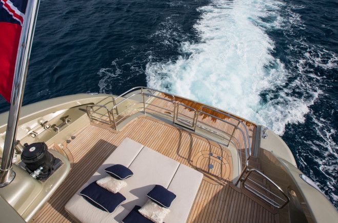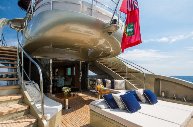 Aft deck: lounge seating area,with 2 low tables opposite each other. central sunpad