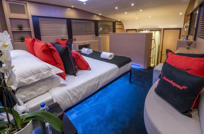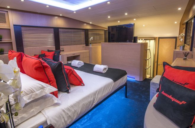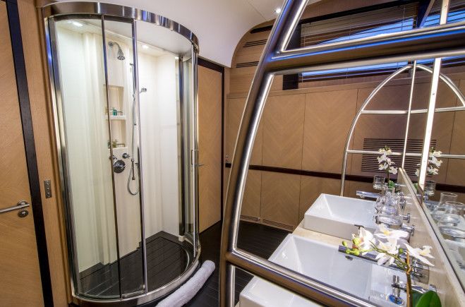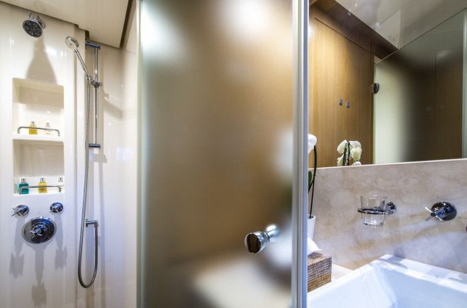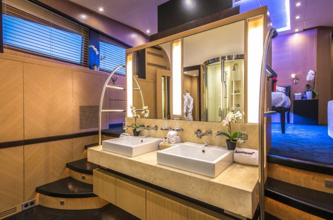 Master Cabin full width Split level stateroom with sleeping area on the main deck level with forward steps either side of the stateroom leading down to stunning open plan bathroom area - large shower, separate toilet, double sinks and dressing room.