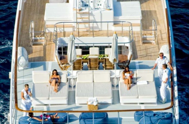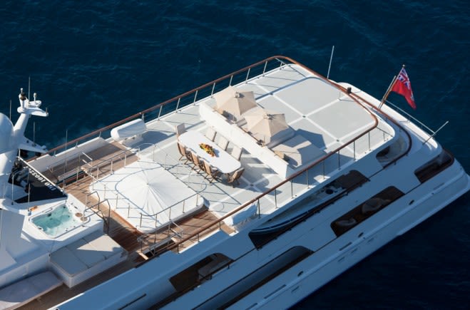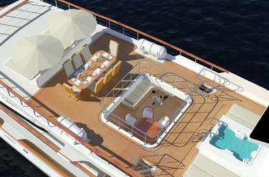За баром находится зона для загара с подушками и лежаками. Далее в задней части сандека установлен стол для обедов на свежем воздухе, огромные зонты смогут закрыть его от солнца, если понадобится. В самом конце этой палубы есть три огромных матраса для принятия солнечных ванн, а для защиты от ветра предусмотрены специальные щиты.