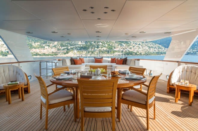 За кабинетом открывается верхняя палуба. На ней находятся два обеденных стола из тикового дерева, затененные тентом сандека или освещенные солнечными лучами через атриум. Рядом устоят удобные плетеные кресла и диван U-образной формы.