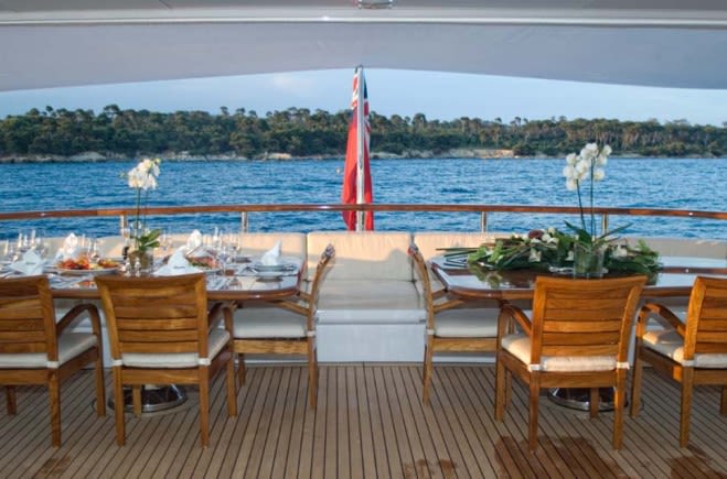 На главной палубе за салоном находится затененная кормовая палуба с круглым столом из тикового дерева и диванчик. Лестница на корме ведет к плавательной платформе.