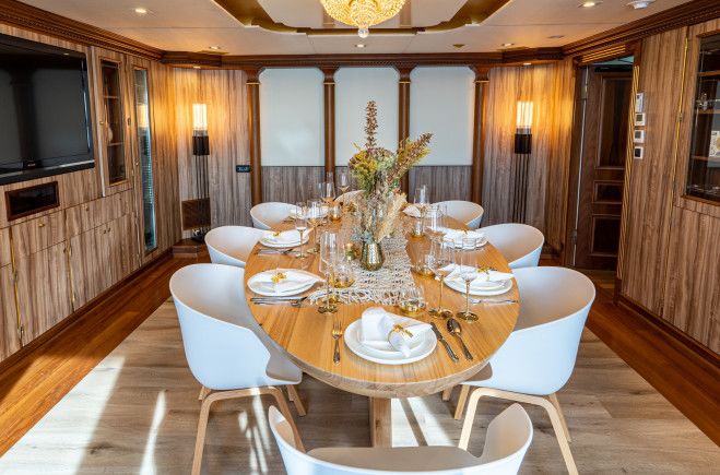 ’iRama’ was built in 2009 and recently refitted in 2020. Her elegant exterior and interior styling are the work of Concept Marine, who is also responsible for her engineering. On the inside, IRAMA offers a welcoming and warm atmosphere, with luxurious touches of plush furniture, cushions and other luxury amenities and decorations. There is a separate elegant dining area adjacent to the main saloon