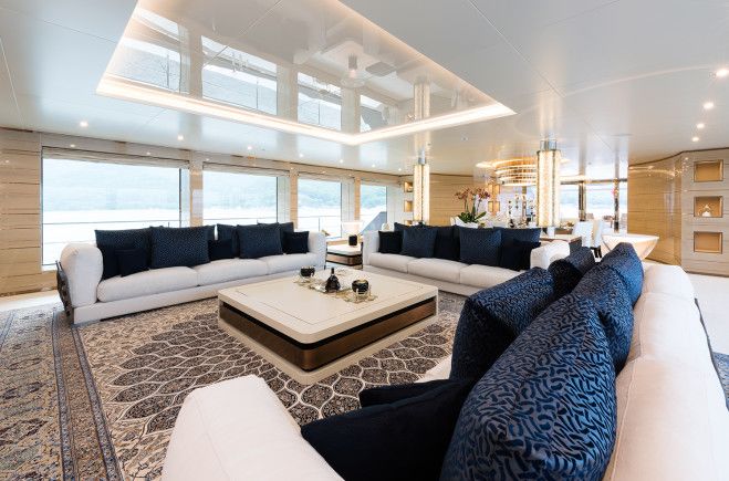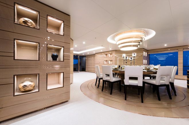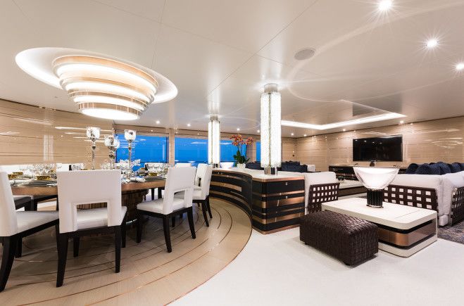 Large Main salon with dining area. the dining table sits under circular ceiling design