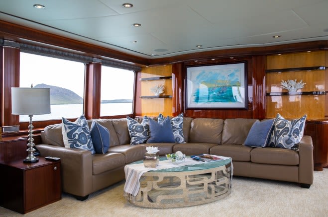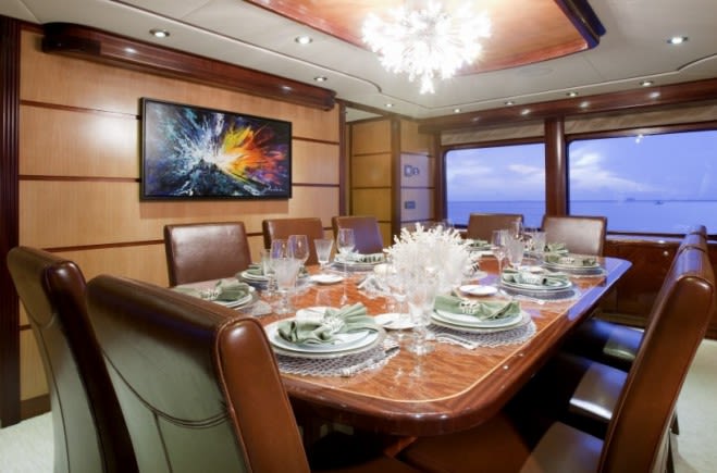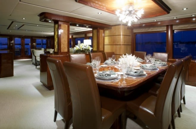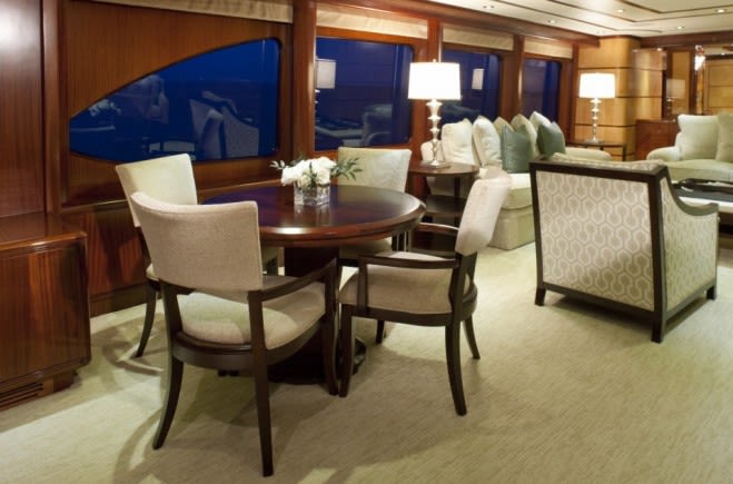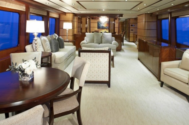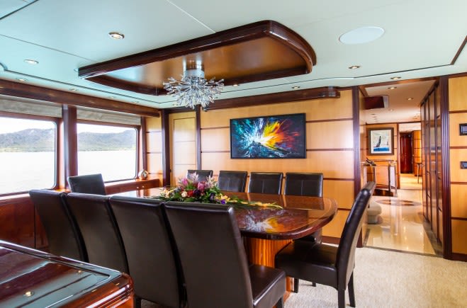 Ширина салона от борта до борта, в нем установлен самый современный телевизор с боковой подсветкой и ЖЛ экраном с диагональю 46”, также по левому борту расположен комфортабельный лаунж. Обеденная зона открытой планировки позволяет накрыть стол на 12 персон, она расположена перед салоном.