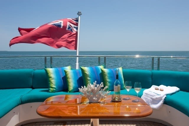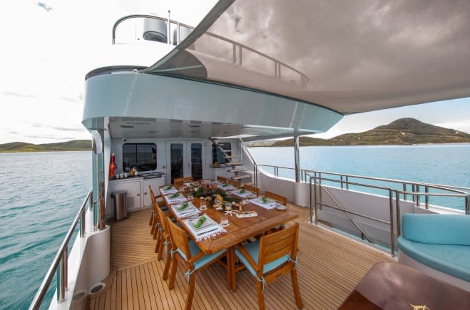 Зона для отдыха и обедов на свежем воздухе находится в кормовой части палубы, что создает альтернативу залу для торжественных обедов, расположенному ниже, а также на корме оборудовано прекрасное место с диванами, где так уютно можно посидеть с коктейлями.