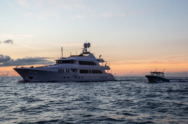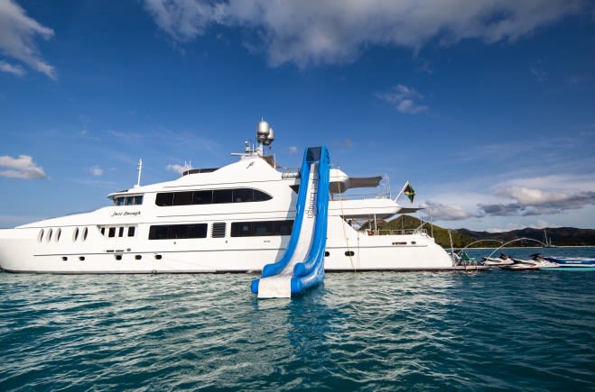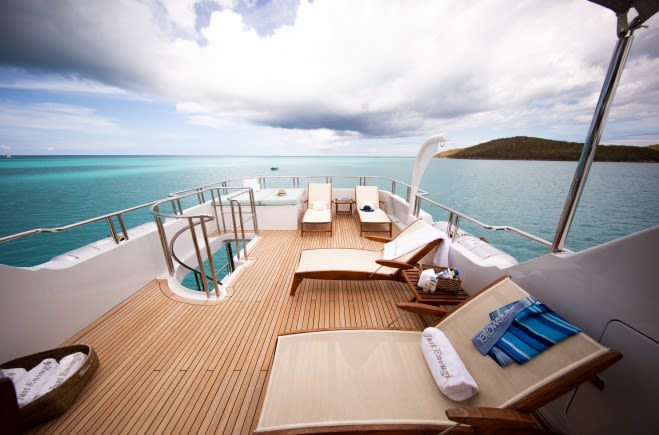 Пройдя вперед мимо мостика гости могут воспользоваться закрытой территорией, где расположены два больших матраса для принятия солнечных ванн — по правому и левому борту. Этот приватный уголок находится достаточно далеко от рабочей площадки на носу нижней палубы, где хранятся меньший тендер и вейв-раннер.