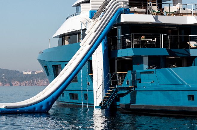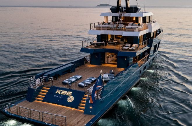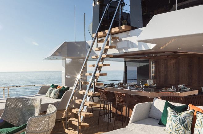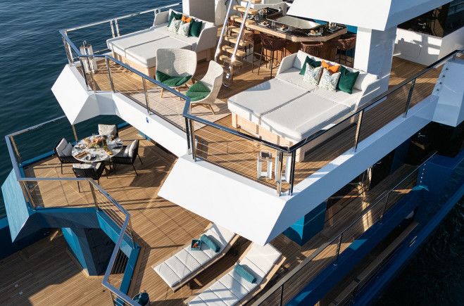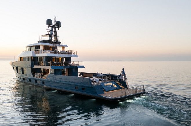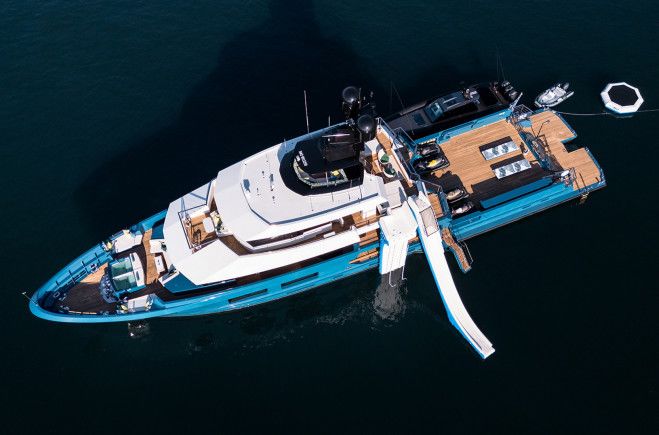 При посадке на борт гостей встречает огромная открытая корма, которая позволяет размещать все необходимые водные игрушки для любых активностей, делая яхту идеальной для любителей приключений. На кормовой палубе предусмотрено место для тендера длиной до 11 метров, дополнительного спасательного тендера и четырёх гидроциклов, при этом используются два отдельных крана. После выгрузки техники это пространство легко трансформируется в большой пляжный клуб, становясь отличной зоной для отдыха и развлечений для семьи и друзей.