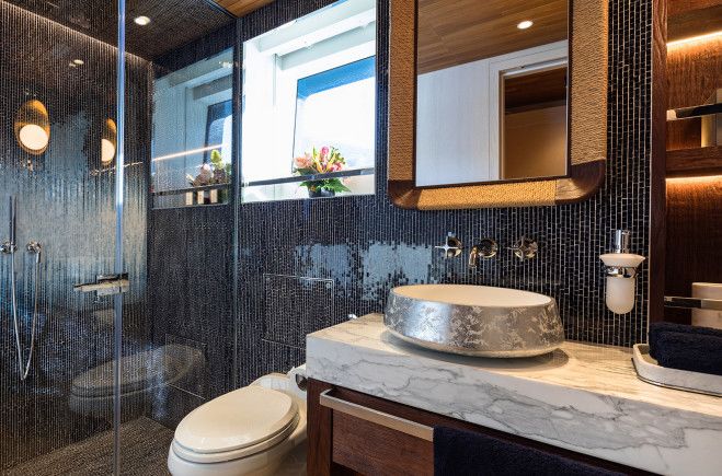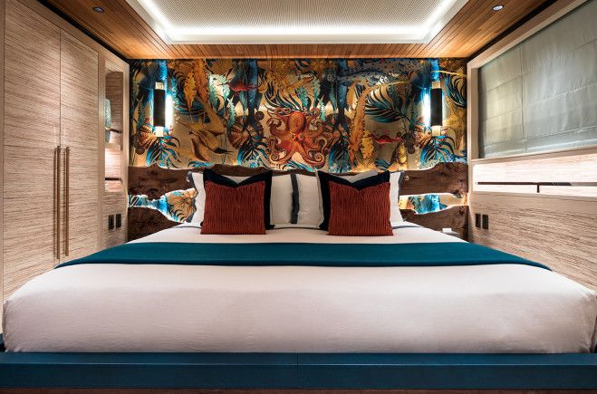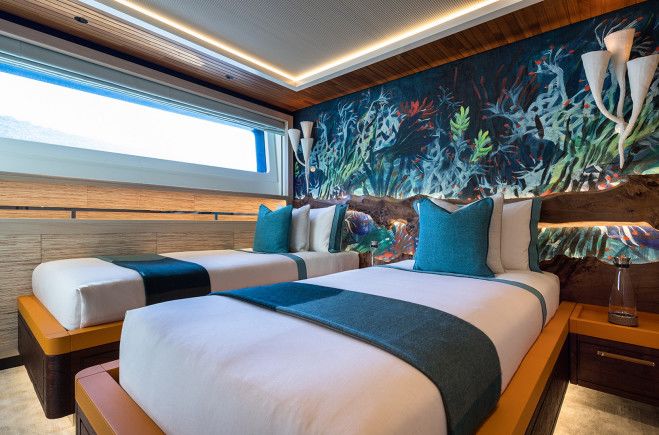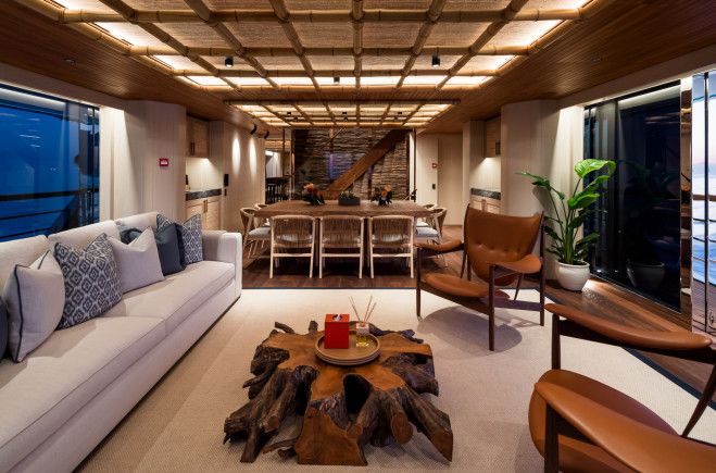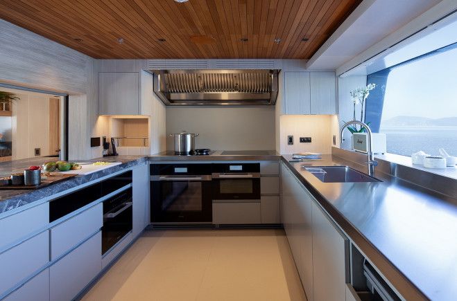 Интерьер объединяет роскошь и природные мотивы: используются натуральные породы дерева и экологичные декоративные панели. Просторные помещения создают ощущение яхты значительно большего размера, а обилие естественного света, проникающего внутрь, усиливает это впечатление.