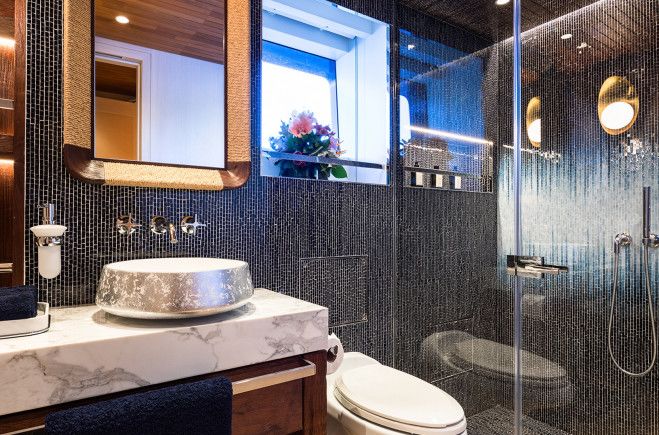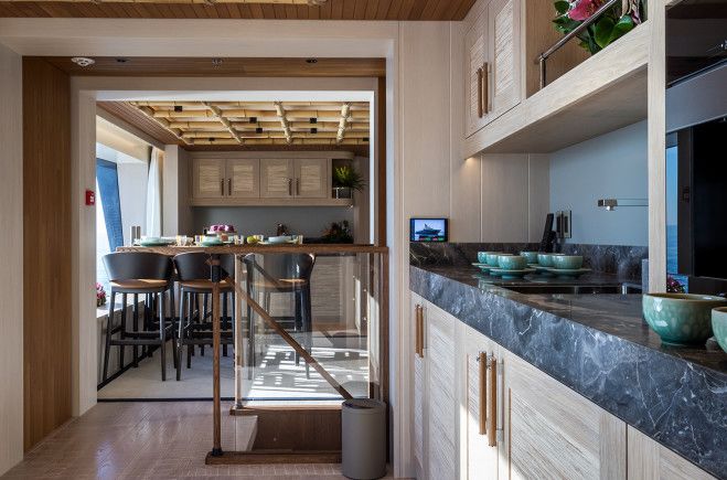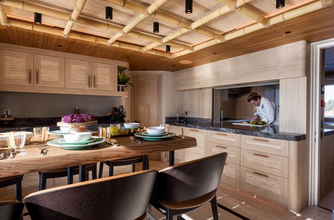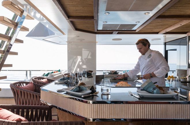 Помимо великолепных видов, кормовая часть мостиковой палубы предлагает ещё одно превосходное пространство для отдыха и общения. Здесь расположен большой теппаньяки-бар, позволяющий гостям наблюдать за работой шеф-повара вблизи. Также на палубе установлен большой телевизор и размещены две сдвоенные лежанки для загара.