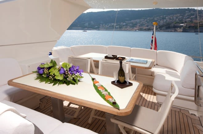 На флайбридже оборудована прекрасная обеденная зона на 12 персон, идеальное место для отдыха и развлечений всей семьей или в компании друзей во время роскошного путешествия на яхте.