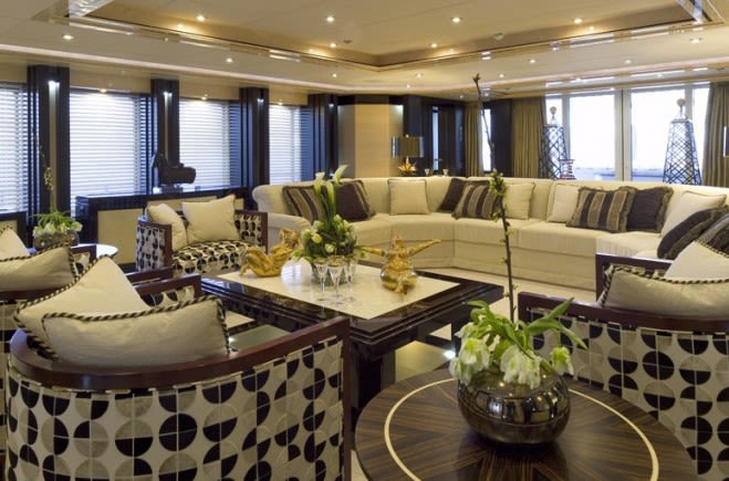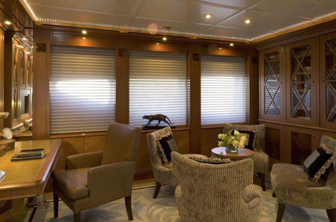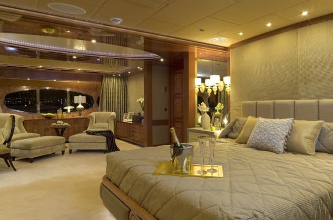 Среди пяти кают этой яхты — потрясающая роскошью каюта Владельца и четыре гостевых каюты. К спальне в каюте Владельца примыкает личный кабинет и большая ванная комната. Отдельная комната для отдыха (ее называют «тихой»), декорирована в стиле, навеянном Азиатскими мотивами, и оборудована собственной ванной. Каждая каюта носит имя одного из великих морей мира, включая Средиземное (каюта Владельца), Балтийское, Эгейское, Адриатическое и Каспийское.