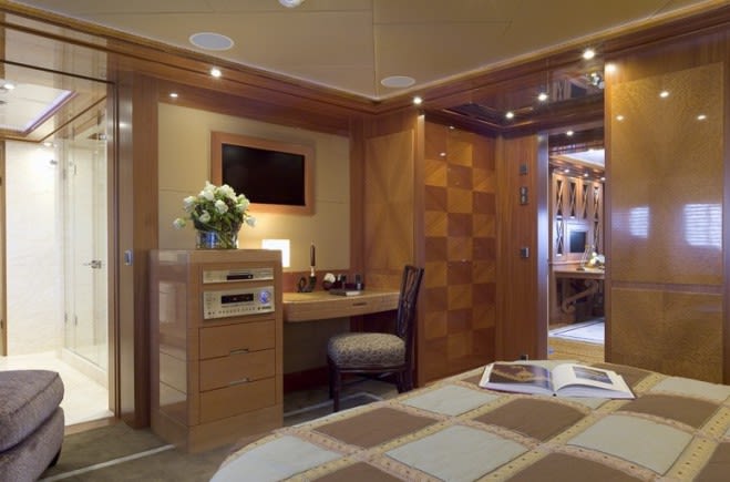 Каюта Владельца расположена на главной палубе в передней части яхты. В каюте установлена кровать размера кинг-сайз, гардеробная в полный рост и ванная комната. К каюте примыкают личный кабинет Владельца и комната отдыха.