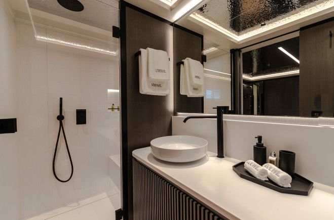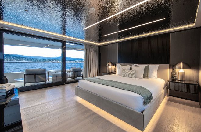 На главной палубе расположена каюта владельца с приватной террасой и джакузи. Ванная комната мастер-каюты оснащена душем с функцией хаммам.
