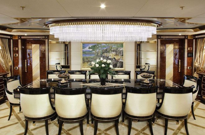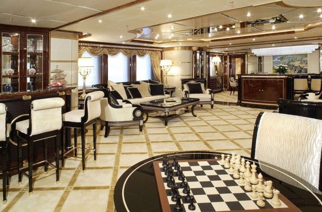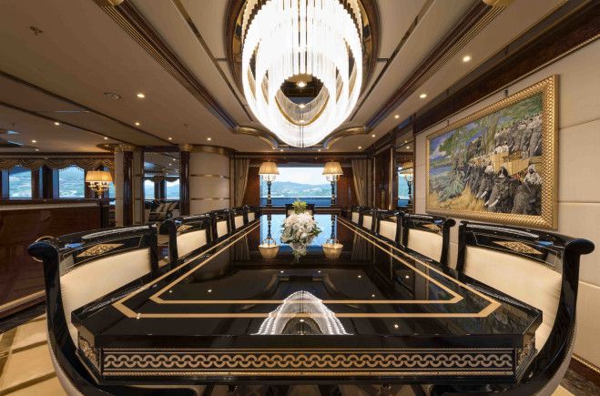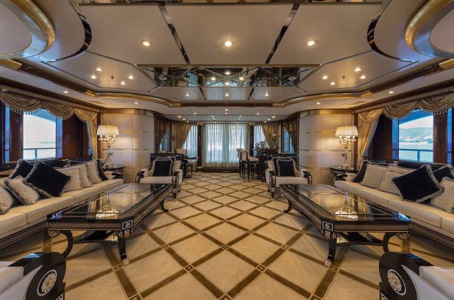 Opulent and exquisite decor with gold accents and cream and black color scheme with wool carpeting throughout. Upon entry located to port is a guest bar and game table with two chairs to starboard. Forward are two identical lounge areas one to port and the other to starboard comprising of a spacious sofa, two occasional chairs and coffee table. Flat screen TV is discreetly hidden in a cabinet which divides the salon and dining area.