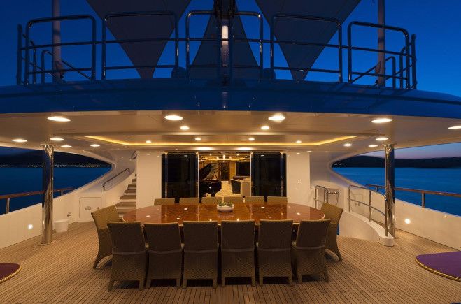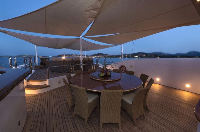 Shaded large oval table offers alfresco dining for 12 guests. Aft wraparound settees with cocktail table to port and starboard.