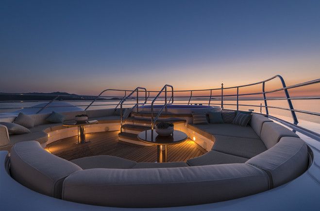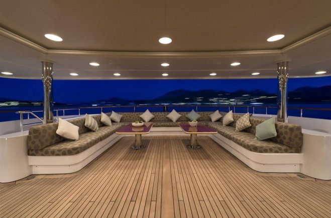 The sprawling sundeck is ideal for entertaining guests. It features multiple lounge areas. Located forward is a large Jacuzzi with wrap around seating and two sunshade umbrellas. Aft of the Jacuzzi is the enclosed guest gym with dayhead and shower along with elevator access. Past the gym is large circular dining table for 12 with adjacent flat screen TV. Located aft is the helipad/dancefloor with modular lounge seating and chaise loungers.