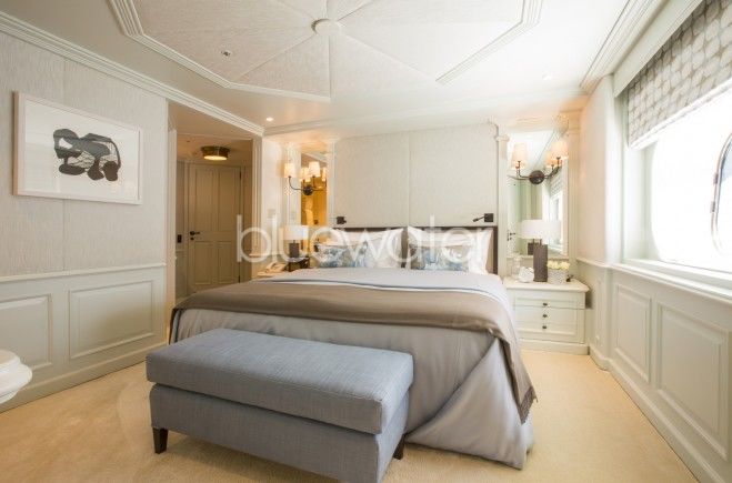 На главной палубе расположена каюта Владельца — впечатляющих размеров во всю ширину корабля, с собственным просторным кабинетом для работы во время путешествий, с отдельной гостиной и с ванной комнатой, отделанной мрамором и ониксом. Каюта Владельца задает высокий стандарт для остальных пяти кают, находящихся на верхней и нижней палубах. Полностью интегрированная аудио-видео система установлена во всех каютах, обеспечивая гостей отличным выбором развлечений на борту.