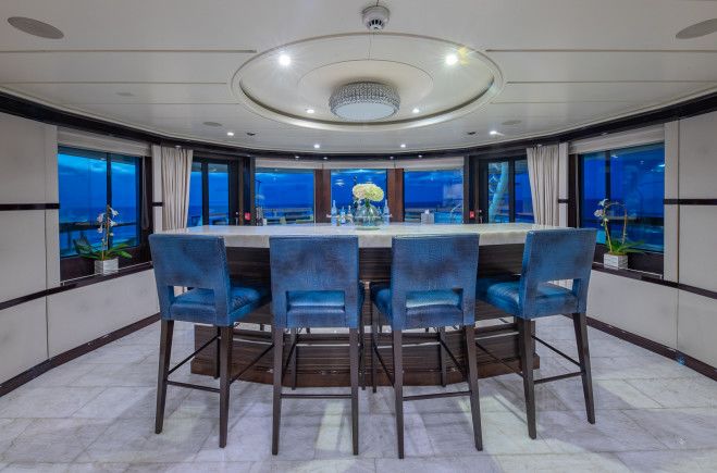 По-настоящему роскошное и приватное пространство. Кабинет владельца расположен в носовой части и примыкает к неформальной лаунж-зоне с диваном и двумя креслами. Телевизор с плоским экраном 42". В спальной зоне — кровать King Size с обходом по периметру, ориентированная по ходу движения, и телевизор 42". В носовой части — раздельная ванная комната «для него и для неё» с большой европейской душевой в центре. С каждой стороны предусмотрены туалетный столик, раковина, унитаз и биде. Вся мастер-каюта оснащена большими окнами, обеспечивающими великолепные виды и обилие естественного света. Сейф. Спальная зона может быть полностью отделена от лаунж-зоны, обеспечивая стопроцентную приватность.
