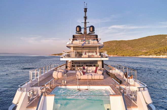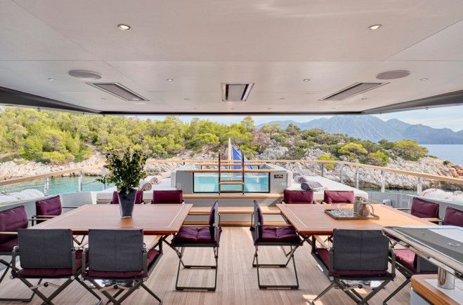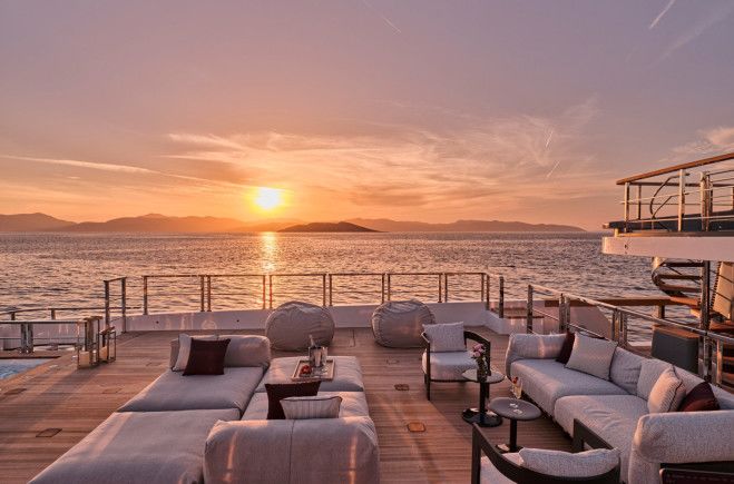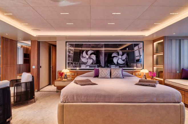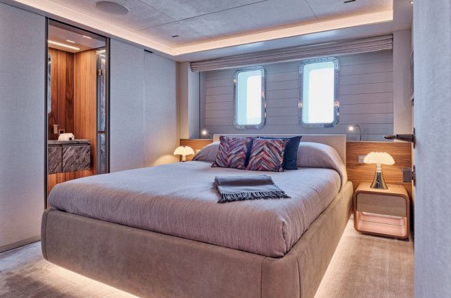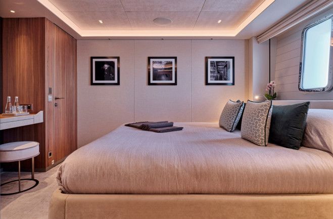 Owner’s Cabin on Main Deck with King Size Bed, opening balcony, walk-in closet and en-suite facilities. Plus adjacent double cabin with Double Sofa Bed, large opening window and en-suite facilities. Can also be used as separate TV room to Owner’s cabin.