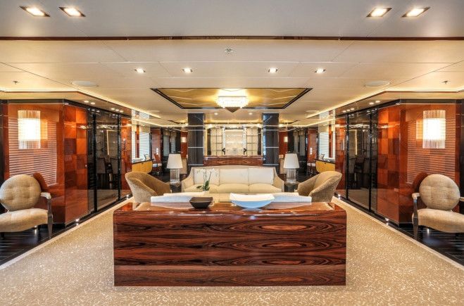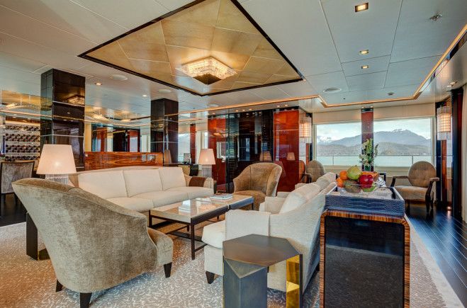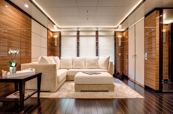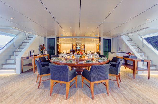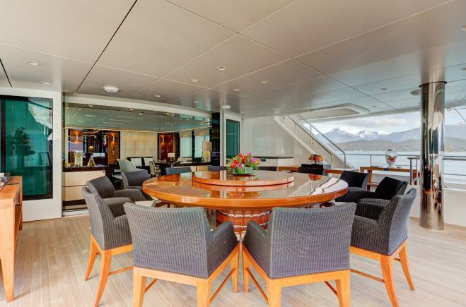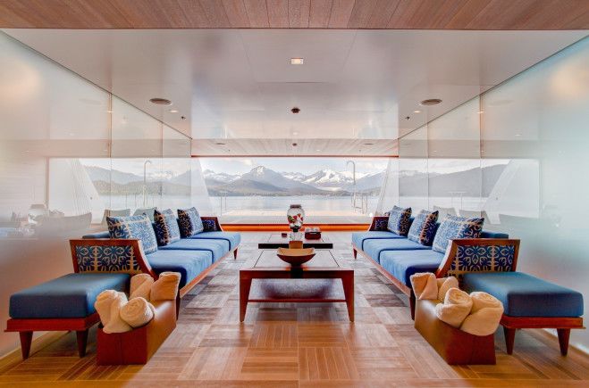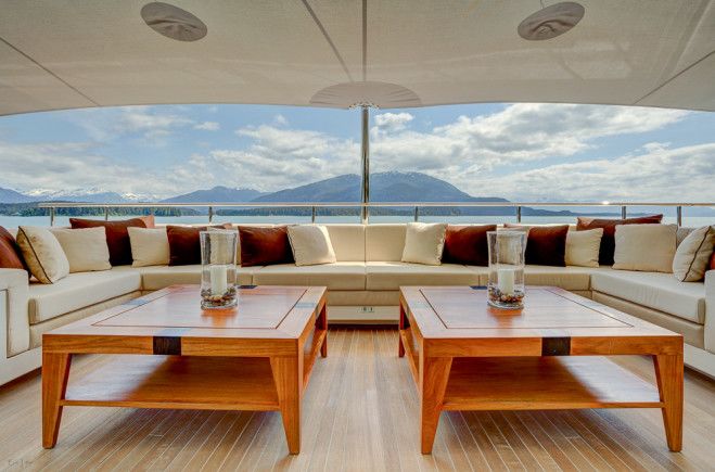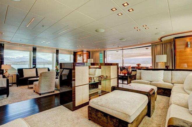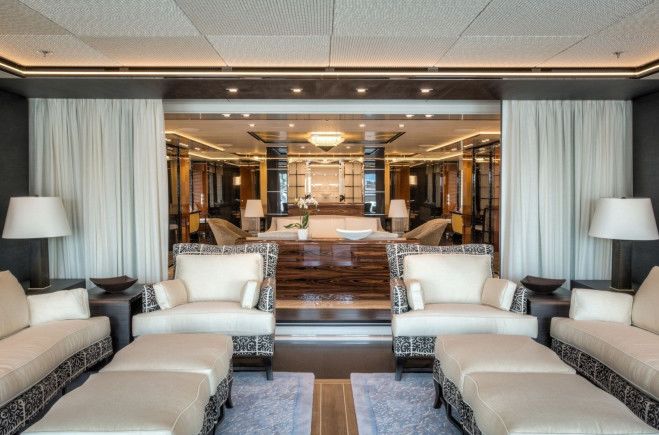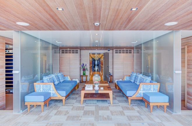 Exquisite decor. Ample innovative lounge areas divided into 2 sections: Aft Salon or "Wet lounge" which is a stunning indoor/outdoor area as you enter from the Main Aft Deck. Two Apple TVs on Port & Stbd side (can be electronically covered with soothing artwork). Full wraparound Alfresco bar. Moving forward is a more formal lounge area with 60" Apple TV.