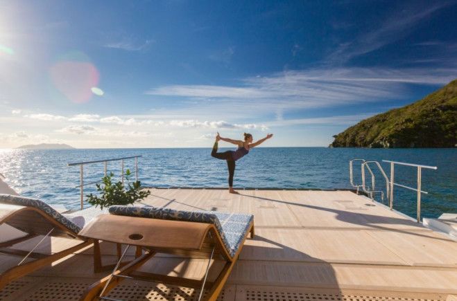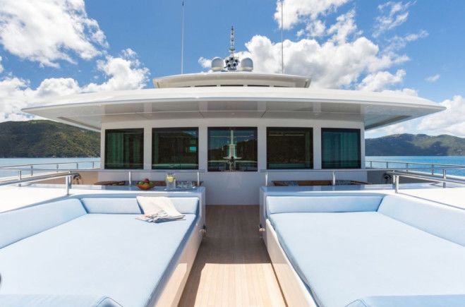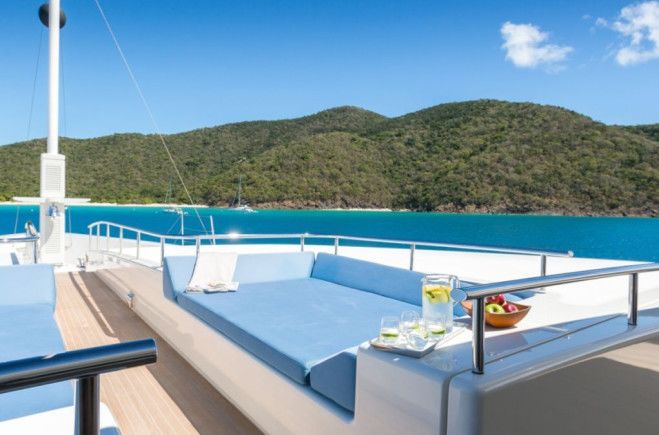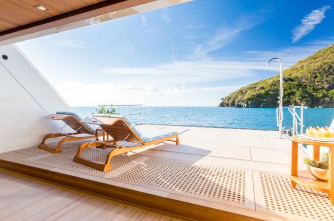 Access to the Aft Deck where there is a Jacuzzi surrounded by large sun pads and 2 oversized chaise lounges. Recumbent exercise bike. Access to "privacy deck" with U-shaped sun pad seating, 2 tables.