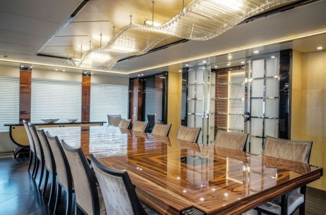 Adjacent to the Main Salon. Formal dining for 12. Table can be separated into 2 sections. Stunning wine cellar which can host 300 bottles of wine.