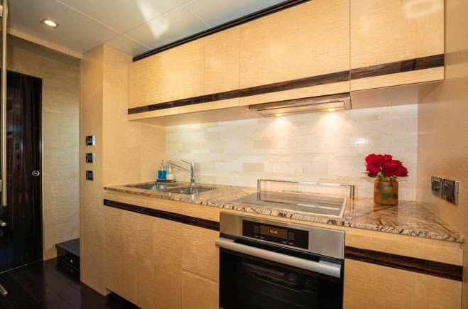 Кухня яхты, по сравнению с предыдущей моделью, стала просторнее, удобнее и имеет теперь прямой выход в бар.