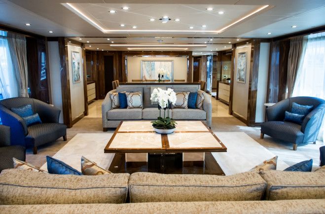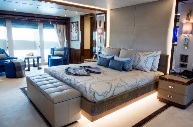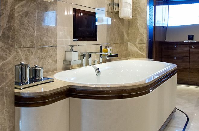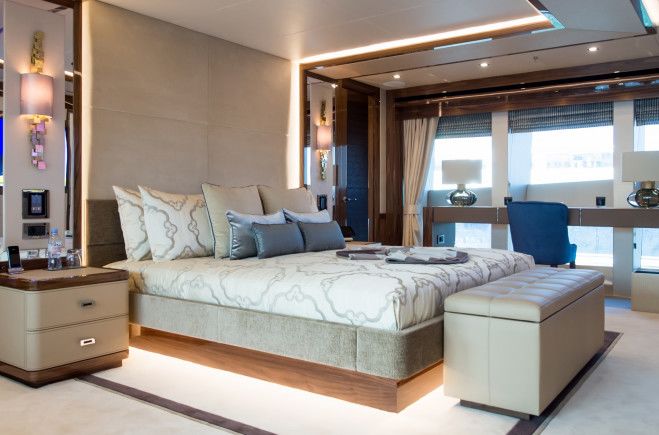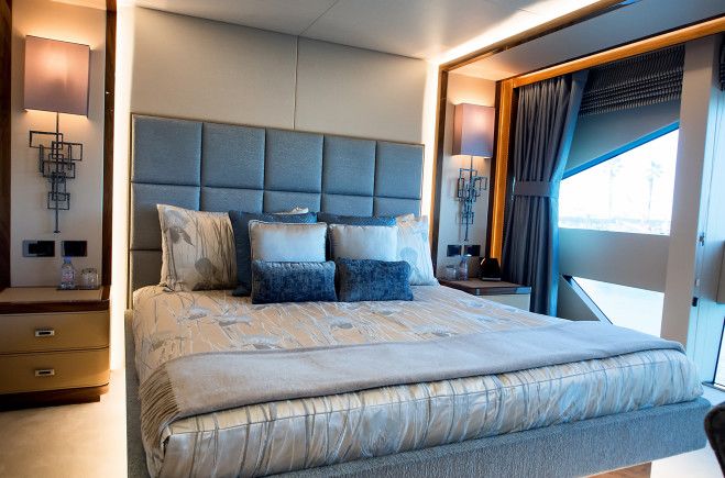 Princess AVK boasts six staterooms in total for 12 guests comprising an ample full beam master, two VIP double staterooms and three additional cabins that easily convert from twins to doubles. The flexible accommodation is great for guests traveling with friends or family, offering an array of options. The master and VIP cabins have floor to ceiling windows, giving a new meaning to “room with a view.”
