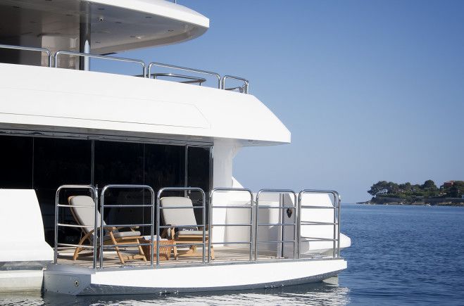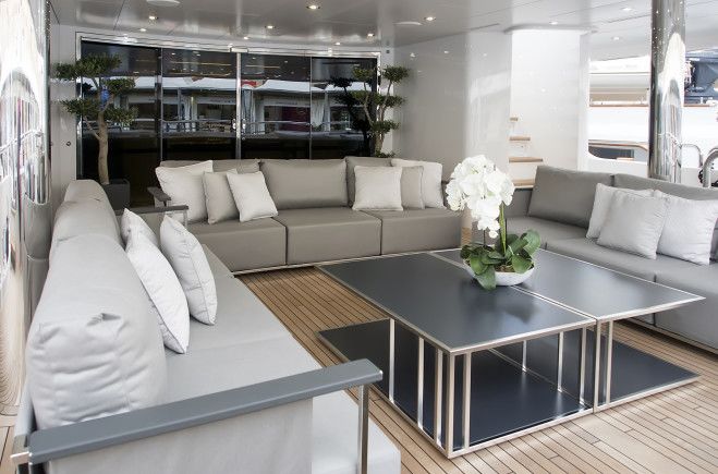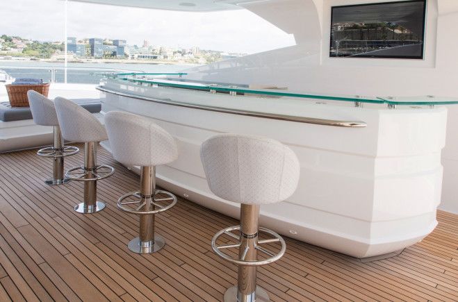 The main deck aft on Princess AVK has a relaxed seating area with coffee tables, an ideal space for relaxing at cocktail hour and reliving the day’s adventures. A glamorous bar and dining area are tucked under the radar arch of the sun deck, and a spa tub is forward, allowing for unparalleled views while in secluded harbours and privacy when moored stern-to in the finest ports in the Mediterranean.