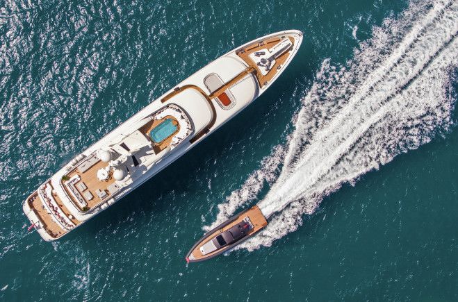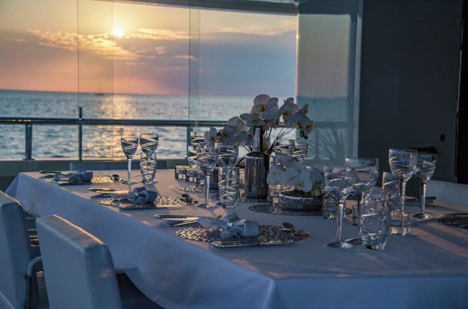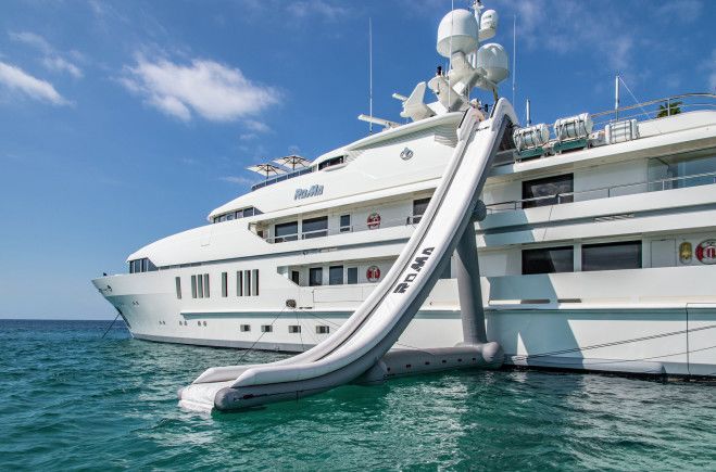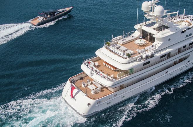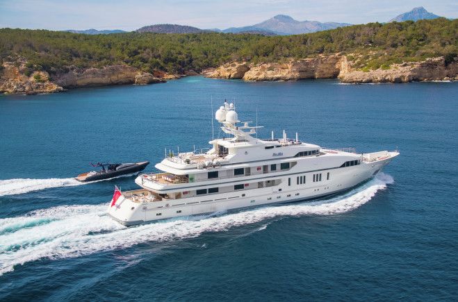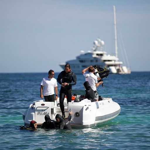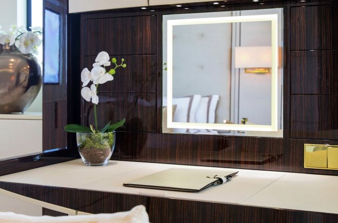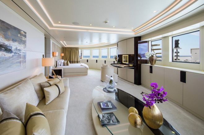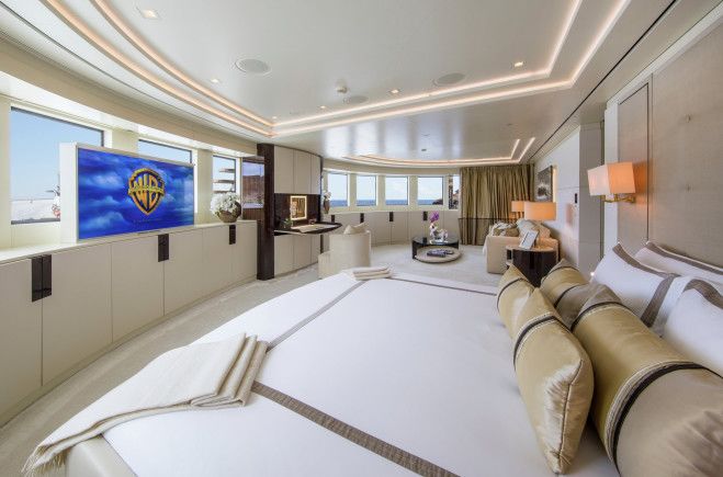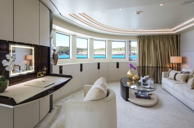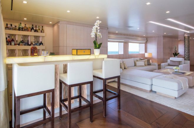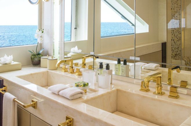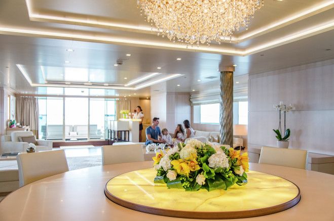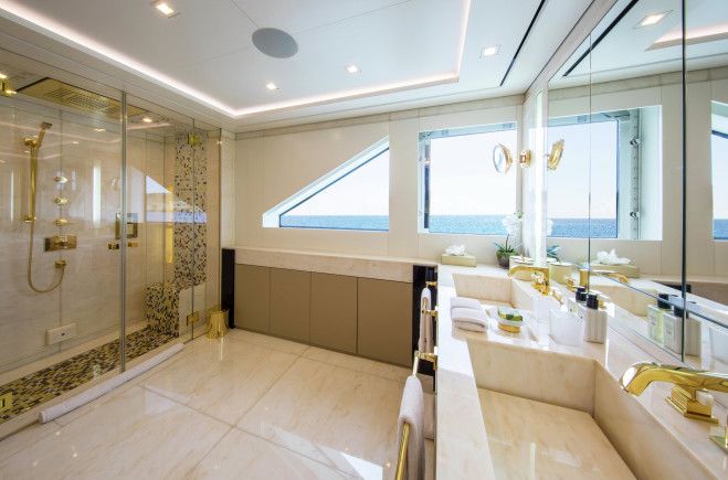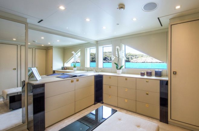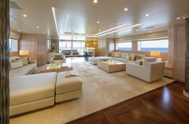 Master Suite: On the desirable Main Deck the entire forward area of the yacht is dedicated to the voluminous Master Suite along with three additional Guest Staterooms. The Master Suite exudes an understated elegance and features a King size bed as well as a pullout sofa for additional flexibility. Panoramic views, a working desk, and a private dressing area compliment this full beam stateroom. Decorated with neutral shades, subtle lighting is used to create a light and airy ambiance. It features a spacious en-suite with a steam/shower room built in beautiful Estremos marble ensuring the ultimate luxury charter experience. King bed: 2m wide Guest Suites: Three Main Deck Guest Staterooms feature en-suite bathrooms as well as a writing desk and separate seating areas. Each of the rooms is swathed in Champagne and cream tones with an alternate theme repeated in the detailing. A fifth Guest Stateroom is located on the Upper Deck, while the Sixth Stateroom is situated on the Lower Deck for those who may enjoy a little more privacy. The single beds in this last cabin can easily convert into a king size bed. There is a drinks fridge and a safe in each stateroom. An elevator services all guest levels. A separate crew elevator for service to all decks. Main Deck Port Fwd: Queen 1.75m wide Main Deck Stdb Fwd: Queen 1.75m wide Main Deck Stbd Aft: Double 1.55m wide Upper Deck: Double 1.45m wide Lower Deck: Twin each bed is 0.9m wide. Convertible to a king bed 1.80m wide All beds have the same length of 2m Main Salon: The over-sized Main Salon is comprised of versatile seating areas that are especially designed with entertaining and relaxing in mind. An outstanding feature on this deck are the backlit onyx bar, dining and coffee tables. The dining area is just forward of the salon and showcases the circular ding table that will comfortably seat 12 guests in style. Cinema / Games Room: One of her most impressive features is a on-board Cinema / Games room on the Main Deck. The walls of which are adorned with fiber optic stars. Upper Deck Lounge: A full beam Sky Lounge with coral accented pillows, is nestled in the same familiar soft cream tones as the Main Salon and Guest Staterooms. Strategically place immense chairs and settee, game table and desk round out this spectacular room. The wall panels, made from Papaya tree bark, feature immaculate joinery. An ample rectangular aft deck dining table provides for alfresco dining at is best, with view-through glass windbreaks for added dining comfort. Sun Deck: RoMa offers a spacious Sun Deck complete with numerous chaise lounges, vast adjustable sun pads, and generous pool with jets that are capable of creating a strong current for the ultimate workout. An alfresco bar is situated just aft of the pool. with large Jacuzzi Pool and Bar and generous seating and lounging with sunny or shaded options under the awning and umbrellas. An air-conditioned superbly-equipped Gym with an expansive view completes the amenities.