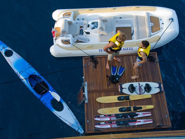 Если вы предпочитаете путешествие на арендованной яхте, полное приключений и активного отдыха — для вас на борту Seagull II приготовлен огромный выбор водных игрушек, снаряжение для подводного плавания с трубкой или с аквалангом, морские каяки, скоростной катер для водных лыж и парусная шлюпка — все это в распоряжении гостей.