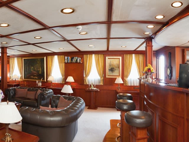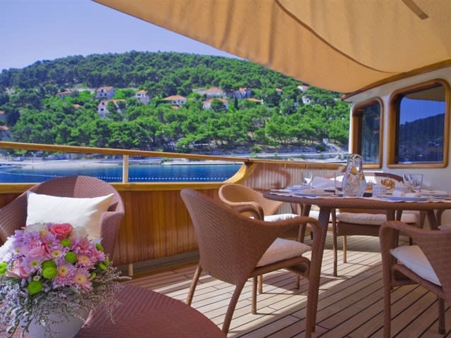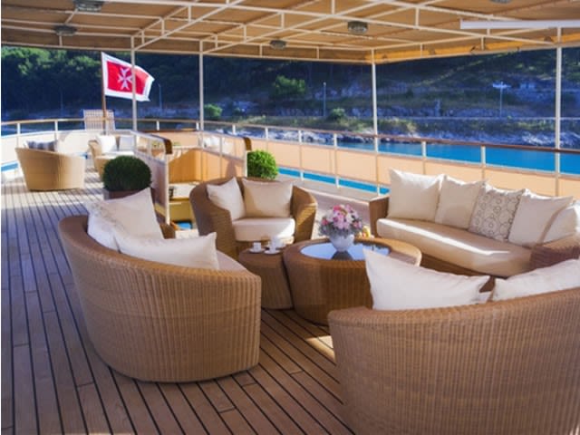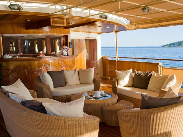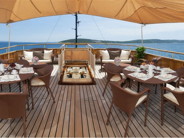 Верхняя палуба предлагает роскошное пространство для отдыха, развлечений или просто наслаждения видами морских просторов и побережий. Можно собраться за обеденным столом внутри или на свежем воздухе под ласковым морским бризом, можно расположиться на сандеке перед большим выдвигающимся телевизором с круговой акустической системой, или провести время вокруг рояля, а кому-то понравится играть в шахматы за специальным игральным столом.