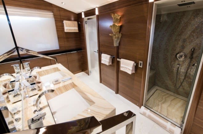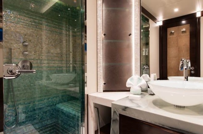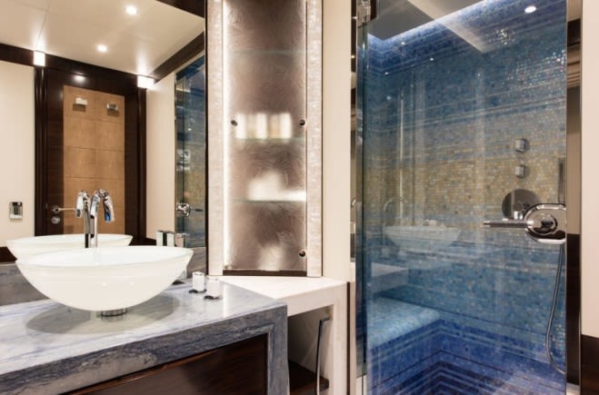 Об особенной планировке каюты Владельца стоит упомянуть отдельно. Каюта расположена на главной палубе, имеет разноуровневое строение, оборудована прекрасной ванной комнатой и соединяется с тренажерным залом, расположенным палубой ниже. Именно там находится балкон с прямым доступом к морской воде. Каюта VIP не менее впечатляющая, огромная кровать в этой каюте обрамлена красивыми золочеными плитками. Две следующие гостевые каюты располагаются на нижней палубе, в ванных комнатах этих кают находится уникальная мозаика потрясающей красоты, плитка ручной работы представлена итальянской компанией Sicis.