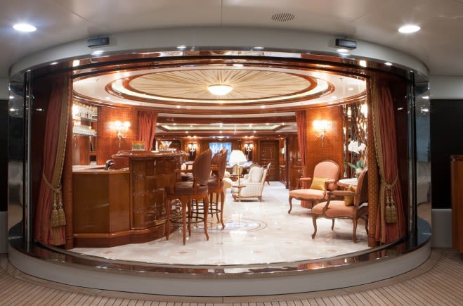 Отделка внутренних жилых помещений многократно убеждает нас в том, что мастерство исполнения здесь достигло высот искусства: достаточно взглянуть на чудесные мозаичные полы, резные скульптурной работы столы, тончайшую инкрустацию и невероятной красоты винтовую лестницу. Два стиля: архитектуры Барокко и Итальянской Ривьеры — наполнили яхту духом великолепия, а лестница, пронизывающая все три палубы, словно несется ввысь, заканчивая свое движение световым фонарем, подходящим под дно бассейн на сандеке, и это, безусловно, добавляет элемент необычного и интересного в гармоничный дизайн яхты.