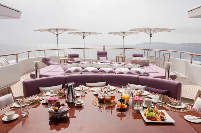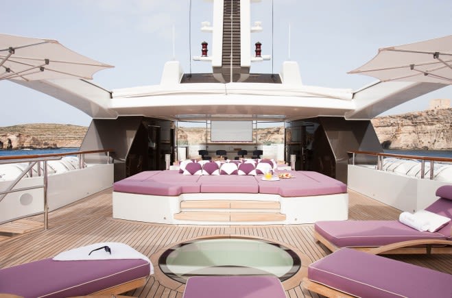 Все открытые пространства палуб в равной мере впечатляют: на сандеке расположены затененные пространства для комфортного отдыха, большой бассейн и огромная зона для развлечений. Владелец яхты, имеющий большой опыт путешествий и отдыха на борту, продумал все так, чтобы каждому гостю независимо от возраста и предпочтений было приятно, интересно и весело.