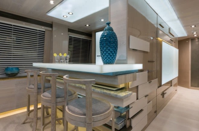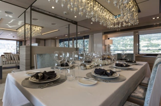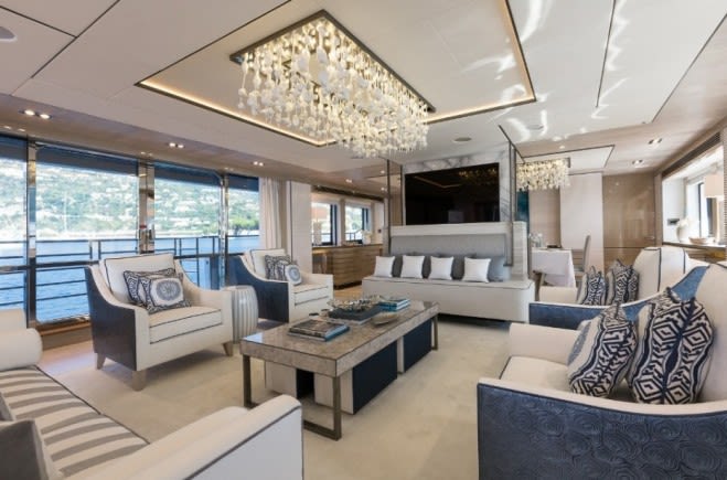 Из главного салона есть выход на балкон. Современная подстветка гармонично вписывается в общих эклектичный стиль, в котором соединились каменные полы и шелковые ткани отделки. Кормовая часть главной палубы особенно хорошо подходит для развлечений и обедов под открытым небом.