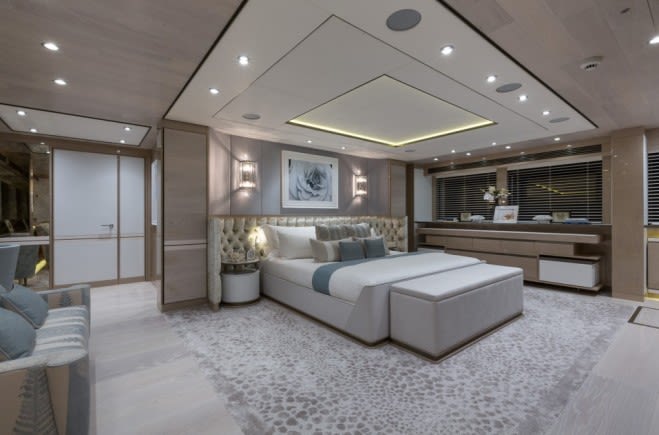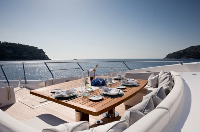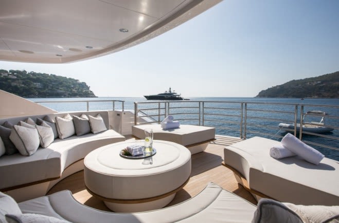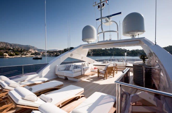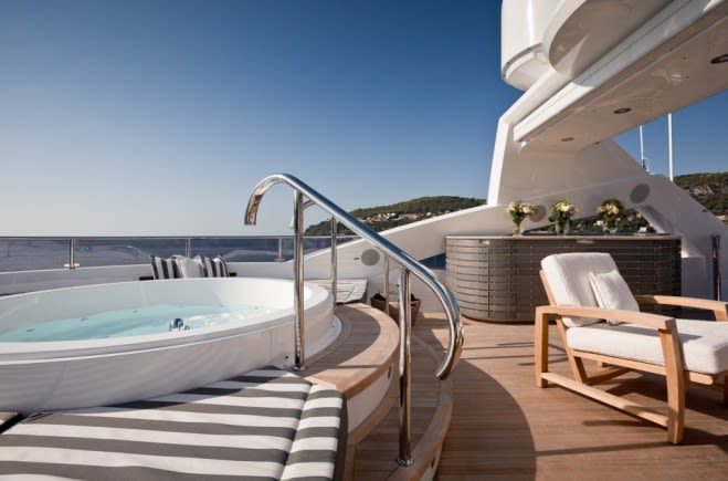 Впечатляют открытые площадки яхты на каждом из уровней. Они включают большой открытый сандек, обеденная зона на верхней палубе, лонж в передней части палубы и круговые диваны с потрясающими видами. На яхте есть просторная зона для принятия солнечных ванн, на одной из палуб расположена Jacuzzi и самая современная развлекательная аудио-видео система.