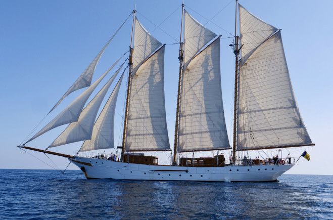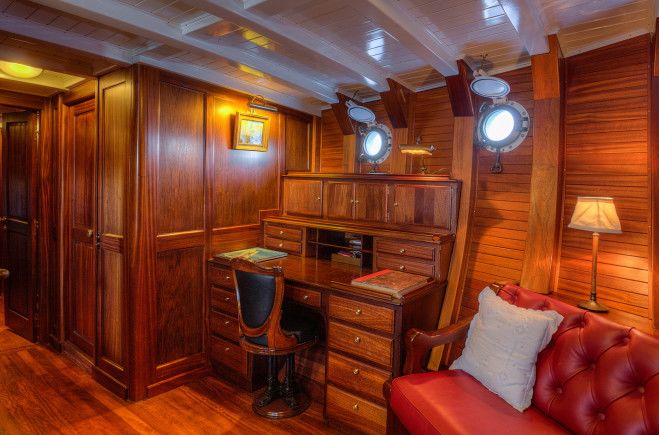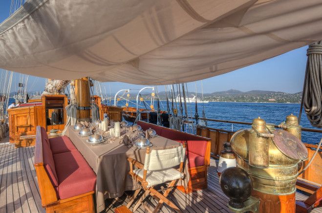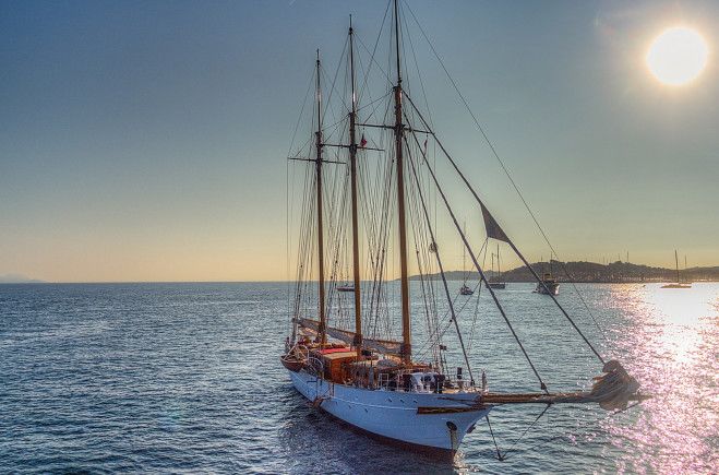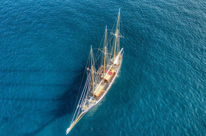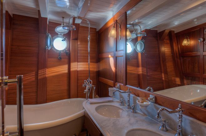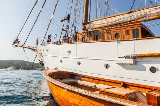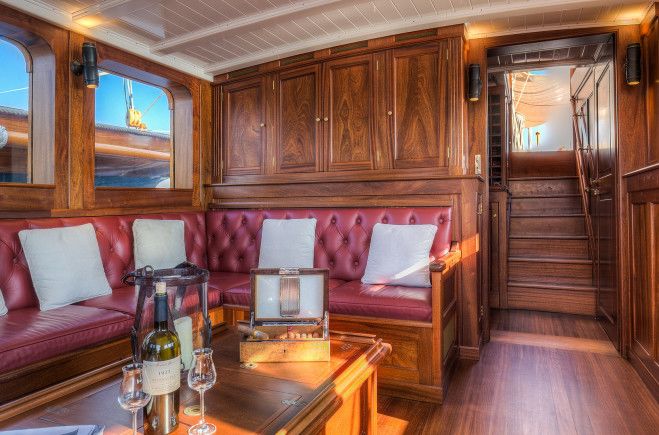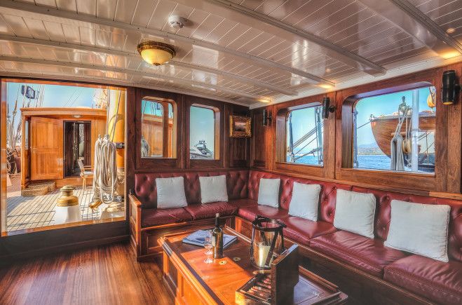 Built in 1927 by Wienerwerft and entirely refitted over ten years from 2004 to 2014, the 49 metre TRINAKRIA is a classic-styled, gaff-rigged schooner equipped with modern amenities. Her interiors reflect the 1920s charm and feature traditional wood flooring, planked ceilings, beams and paneling with artisanal leather furnishings giving a wealth of glamour. Her glamourous interior and exterior appears in several films throughout the 70’s.
