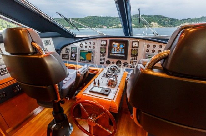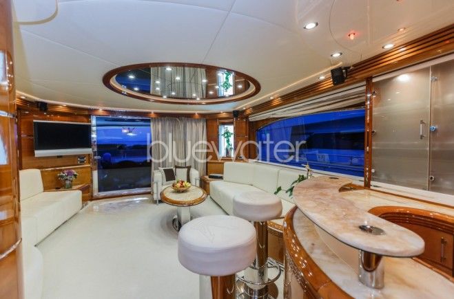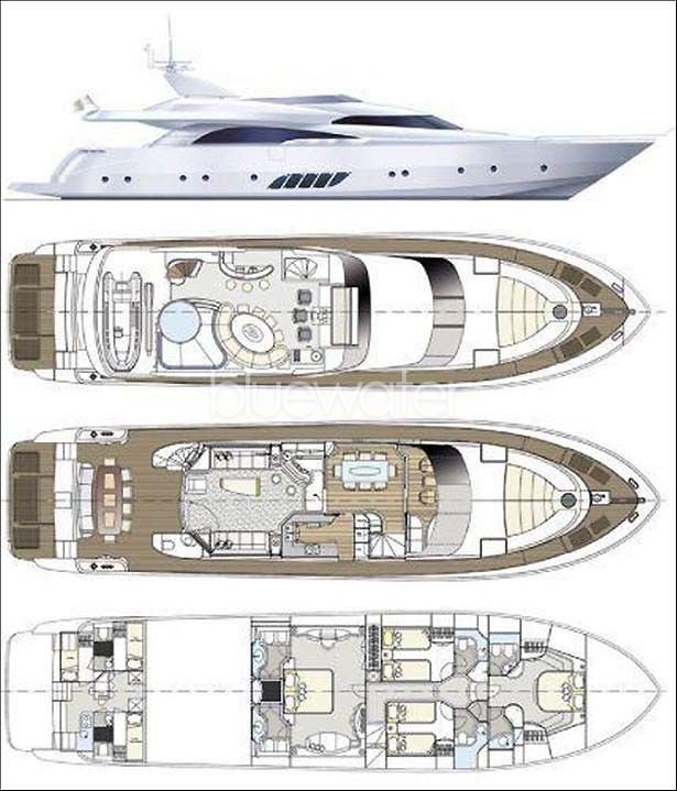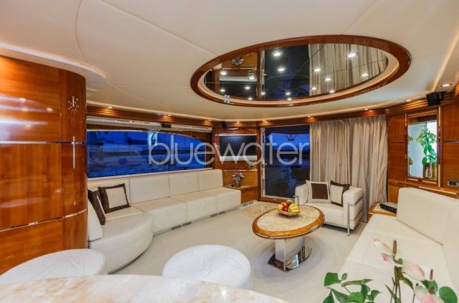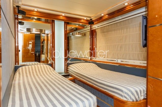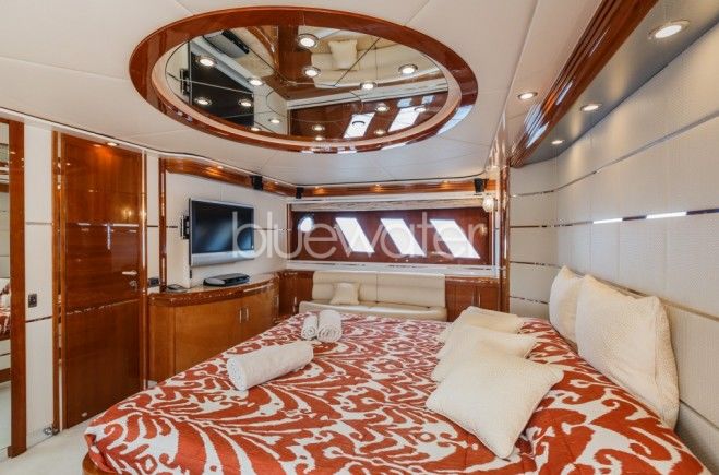 Каюта VIP расположена в передней части корабля, в ней установлена кровать размера куин-сайз. Каюты Twin занимают площадь в срединной части яхты. Все каюты оборудованы собственными туалетными комнатами с душем. В отделке салона и кают использованы материалы высочайшего качества, изысканный дизайн выдает работу итальянских мастеров.
