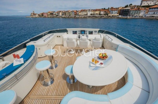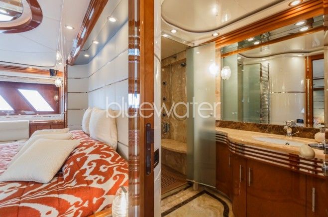 Планировка яхты позволяет разместить во время чартера 8 гостей в двух каютах double и двух каютах twin. Все каюты оборудованы кондиционерами воздуха с собственным управлением, также в каждой каюте есть телевизор. В каюте Владельца установлена большая кровать, диван, через панорамные окна в каюту проникает естественный свет и открываются чудесные виды на морские просторы и побережье. Ванная комната во всю ширину яхты с потрясающим душем отделана мрамором и стеклом.
